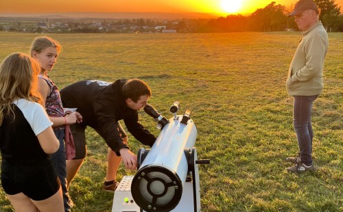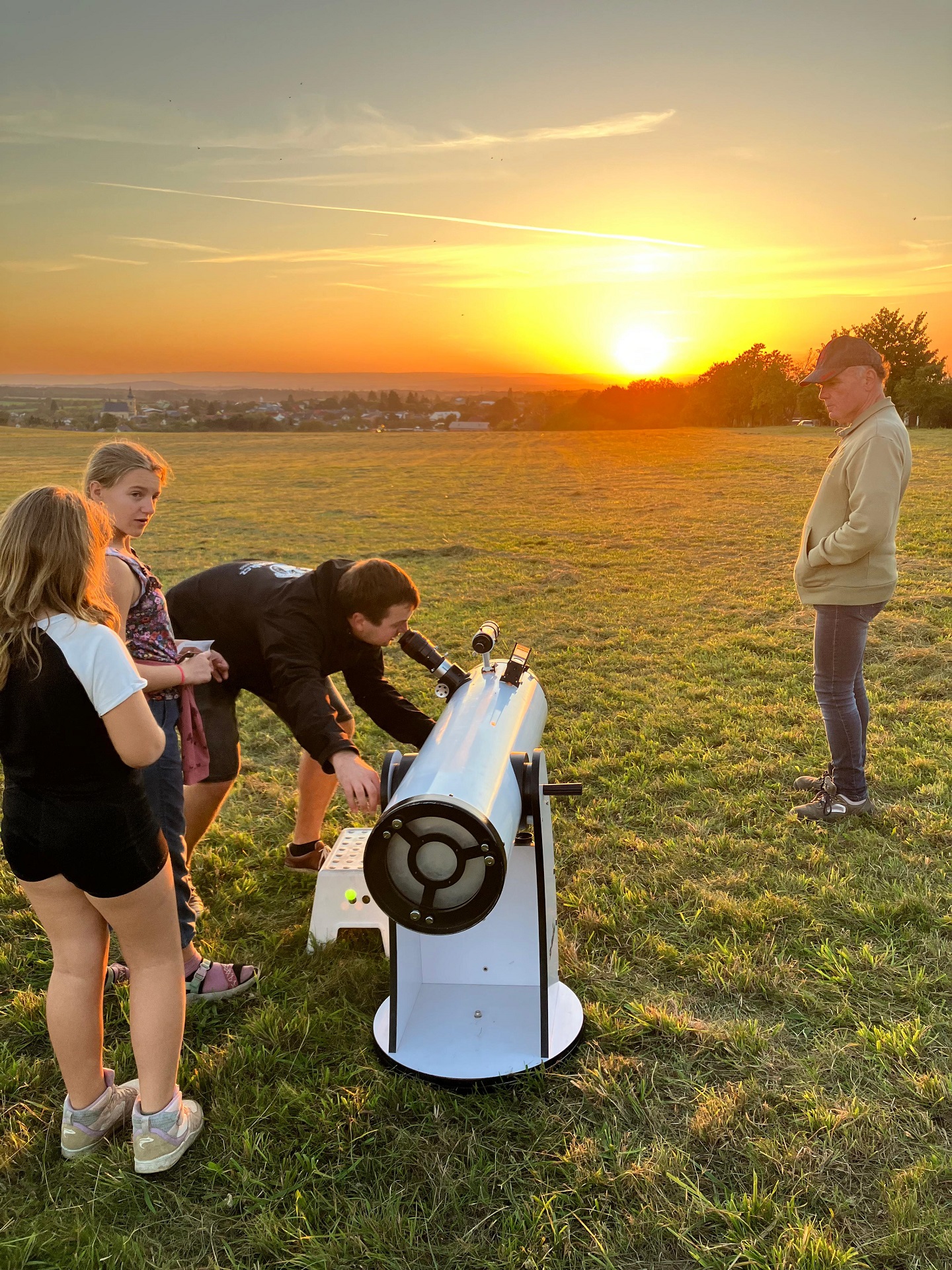 Pozorování pro svoje sousedy zorganizoval Radek, za což mu patří z mojí strany obrovský dík. Takže DÍK! Začali jsme už v šest večer a pokochali se pohledem na zapadající Slunce, které v dalekohledu ukázalo zajímavou kombinaci skvrn. Navíc se předvedl nádherný halový jev zvaný boční Slunce a po západu jsme viděli i krepuskulární paprsky stoupající zpod horizontu.