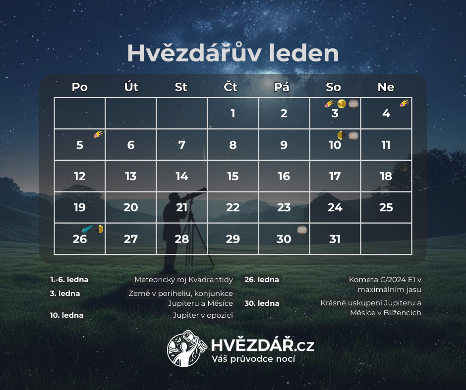 Jaké planety, hvězdokupy, mlhoviny a galaxie budou v lednu pozorovatelné? Dozvíš se opět v pozorovacím plánu, který si můžeš stáhnout níže.