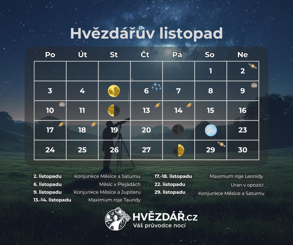 Listopad bude ve znamení padajících hvězd a meteorických rojů. Hojně taky můžete vyhlížet přelety ISS, které budou pozorovatelné už zvečera.