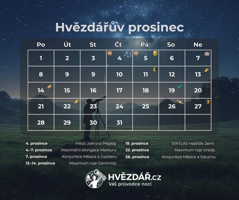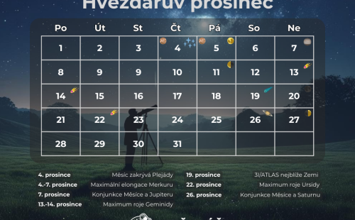 Zahanbit se s podivuhodnými setkáními nenechá ani naše Luna. Hned 4. prosince nám zakryje Plejády. Blízce se taky setká s Jupiterem a Saturnem.